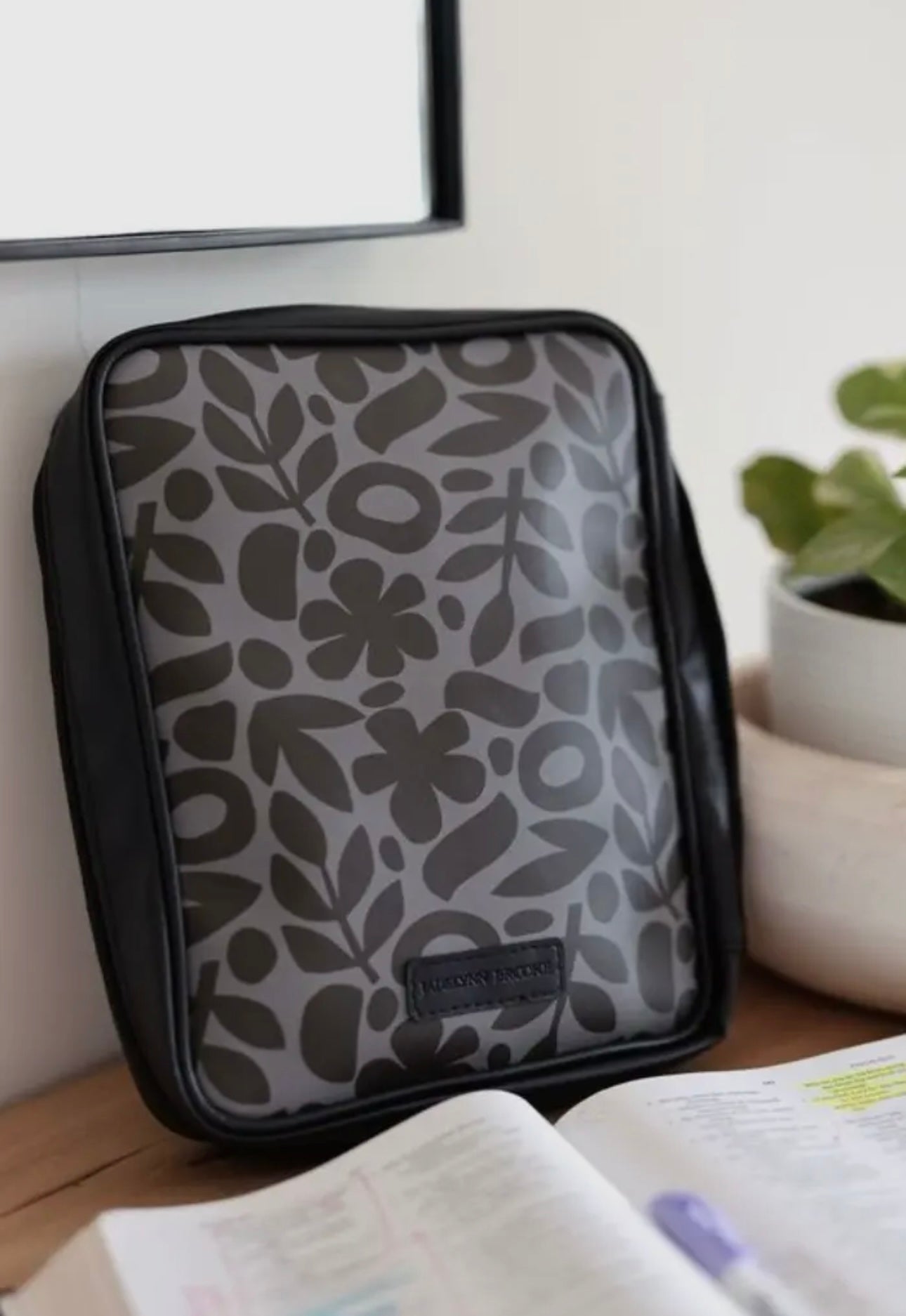 Has a top handle for carrying, wrap around zipper, interior features a pen holder and bookmark